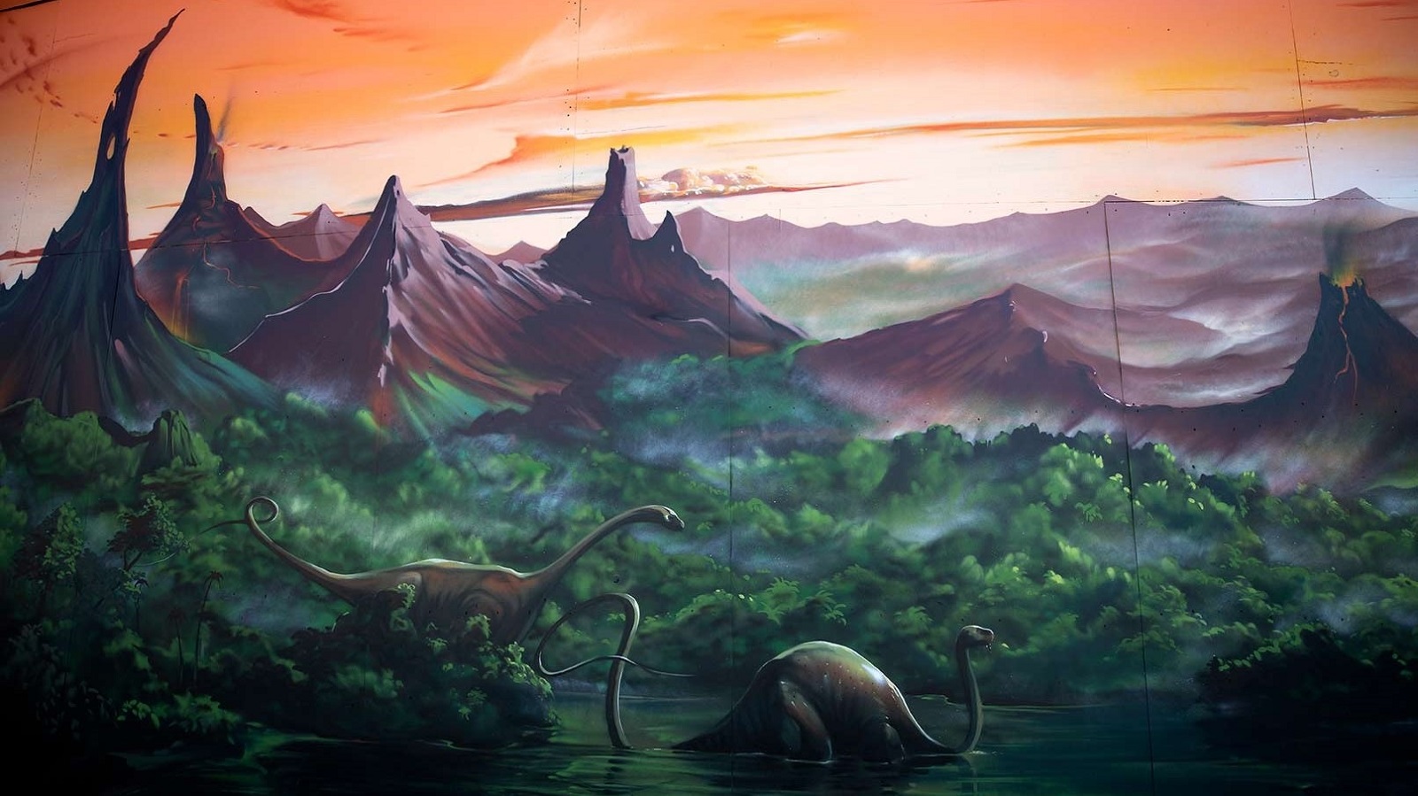 The motives in “Evolution 2” are not only based on the original piece. Since the fence is so long, it is possible to go into more detail in the different time periods, each being separated with a curtain and another background colour. Flüggers Brand Ambassador, Lone Nordby is very pleased: “It is a really colourful work which speaks to everybody at all ages. I have seen by passers who have been drawn towards the work – and because of the abundance of appealing motives you will probably get lots of selfies on social media with parts of “Evolution 2” as background.”