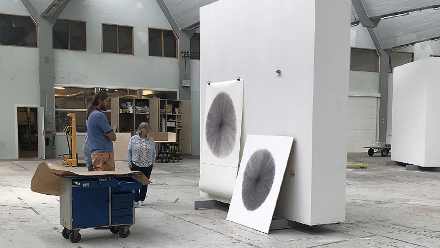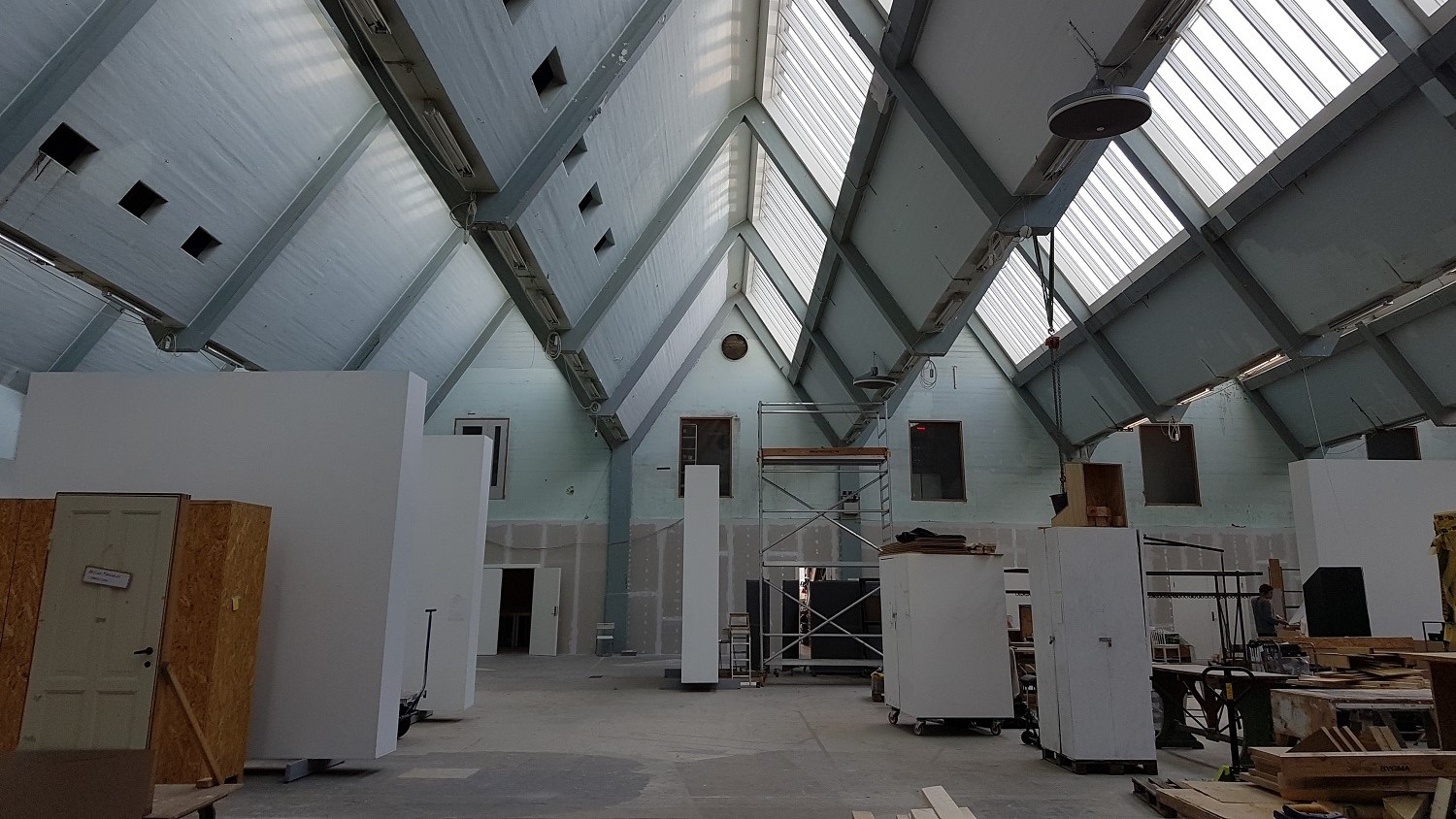 In the 1000 m2 production hall in the middle the laundry facility the shed roof provides a fantastic light. The accommodating hall with the light blue walls is today used as both a production hall for the artists in The Factory and for external artists who need a large facility in production of their artwork. The production hall is also used as an exhibition hall.