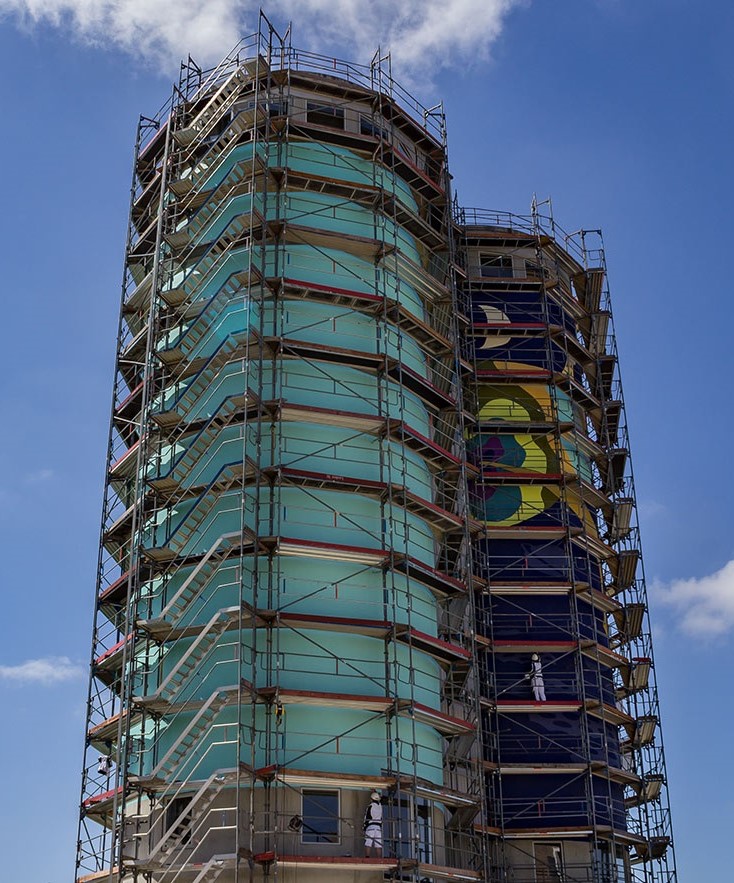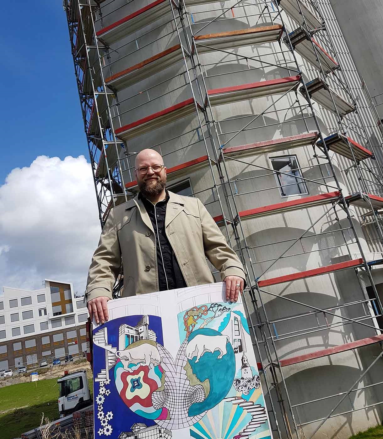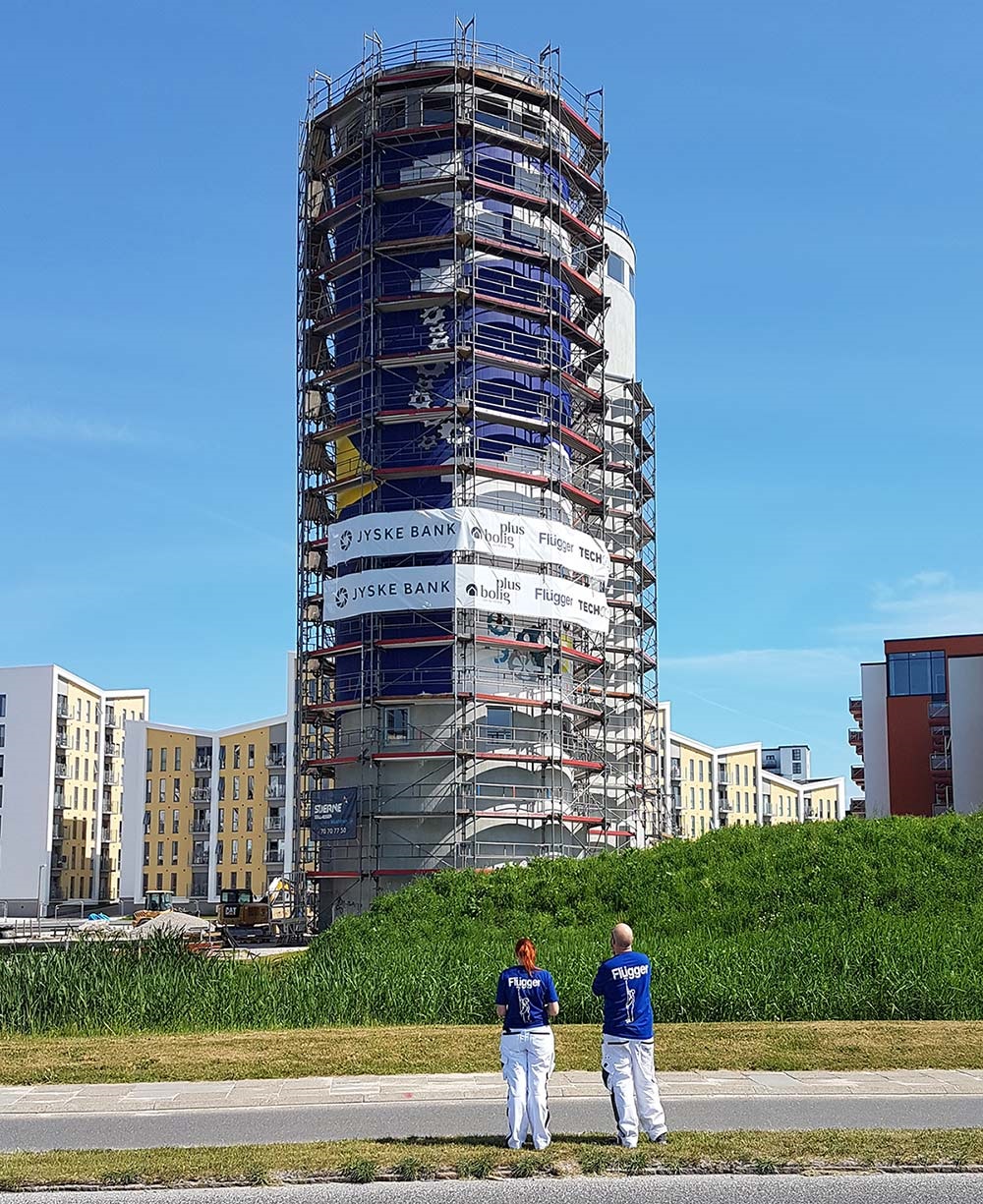 The scaffolded twin silos are now being decorated with a colourful work of art by the artist Jonas Pihl. The artwork will be painted by trainee house painters and decorators from TECHCOLLEGE in Aalborg with paint sponsored by Flügger. Projects such as these are a chance for the trainees to practise their painting skills. On previous occasions, such projects have helped to secure traineeships for the trainee house painters and decorators involved. Like in 2016, when Flügger participated in a project that involved painting a 1,200-square-metre artwork on the Hedegaard silo on the Aalborg harbour front.